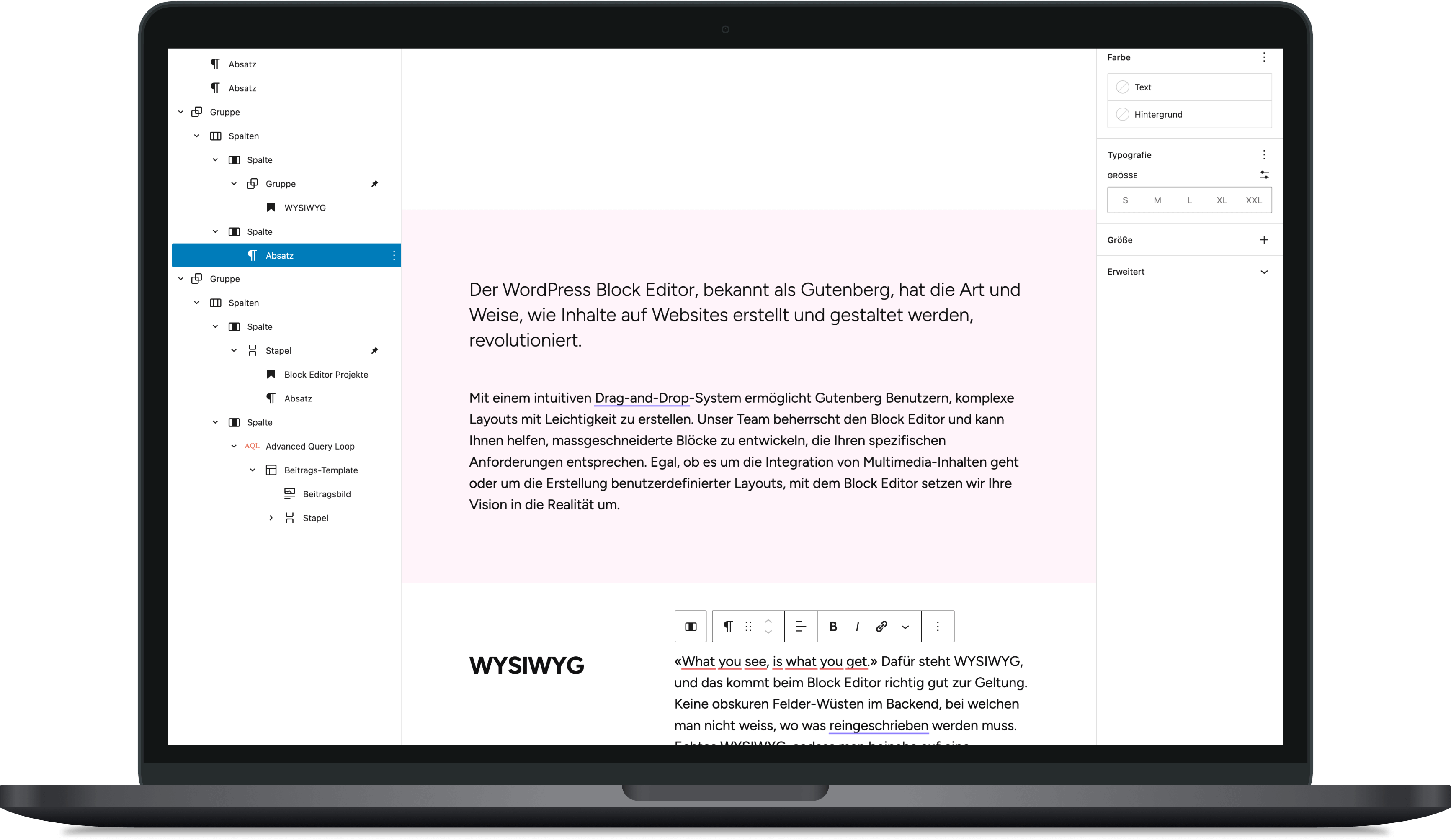 The Block Editor is the heart of the modern WordPress experience. It makes it possible to create content in a visual and structured way – without any programming knowledge. Whether headline, image, gallery or quote; there are separate blocks for everything that can be flexibly combined.